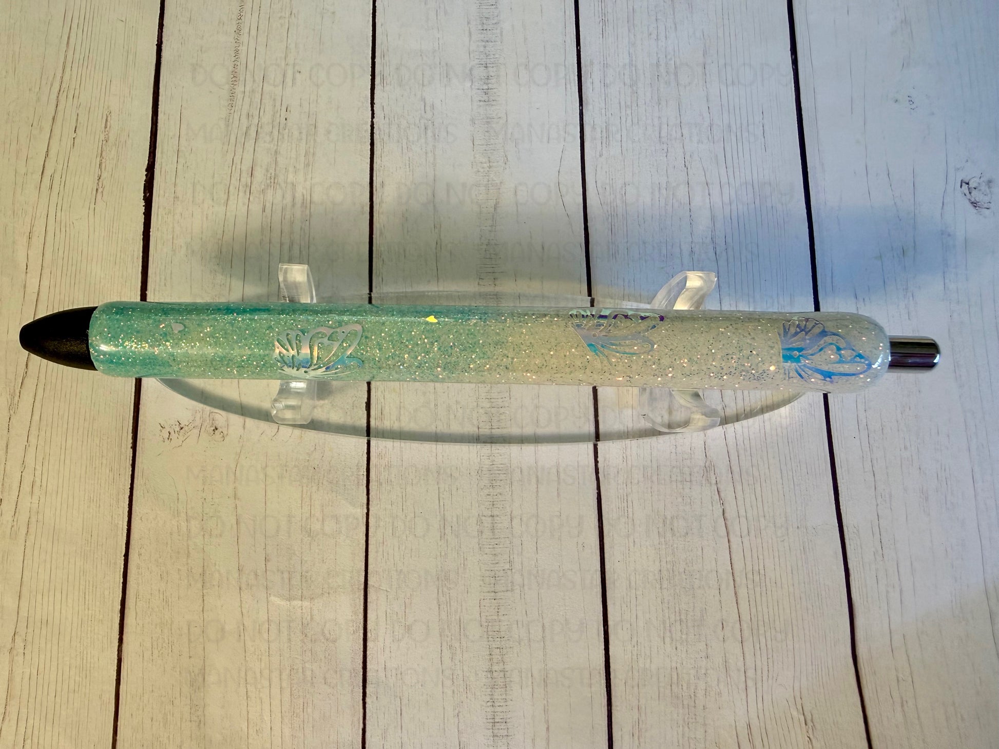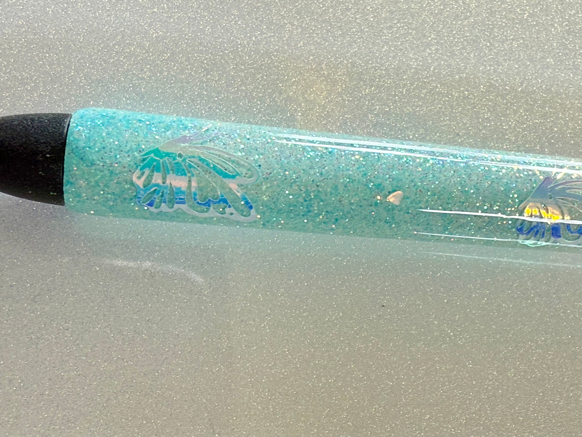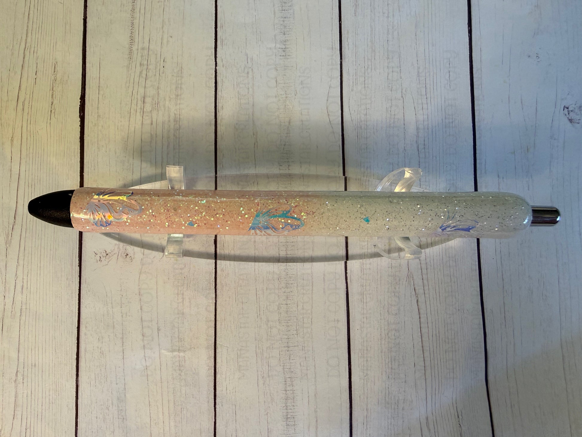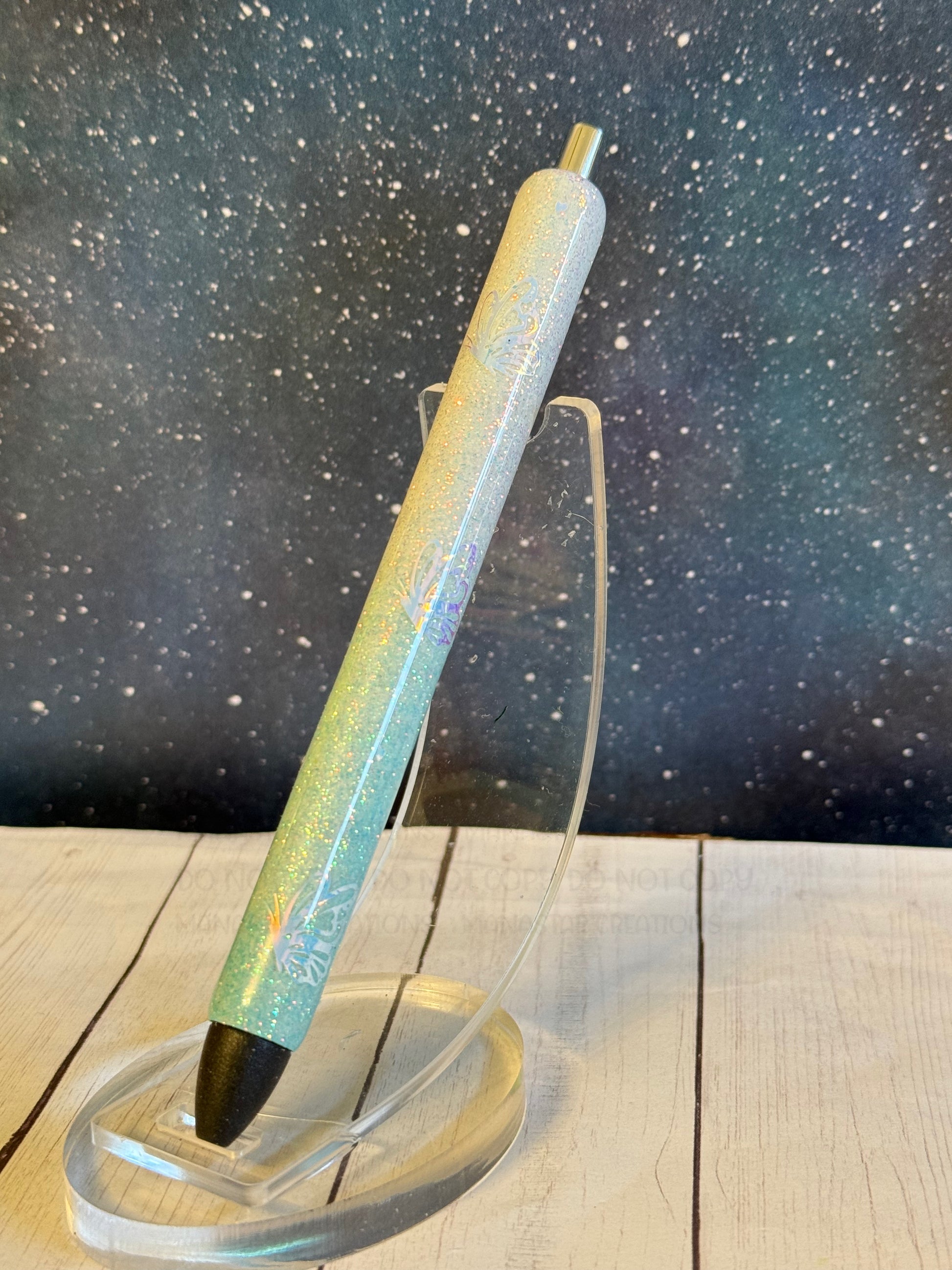Add a touch of sparkle to your writing with this glittered epoxy pen, beautifully adorned with holographic butterflies and hearts” This elegant, refillable pen combines style and inspiration, making it perfect for daily journaling, note-taking, or gift-giving. Durable and eye-catching, it's a meaningful accessory that brings encouragement with every stroke.